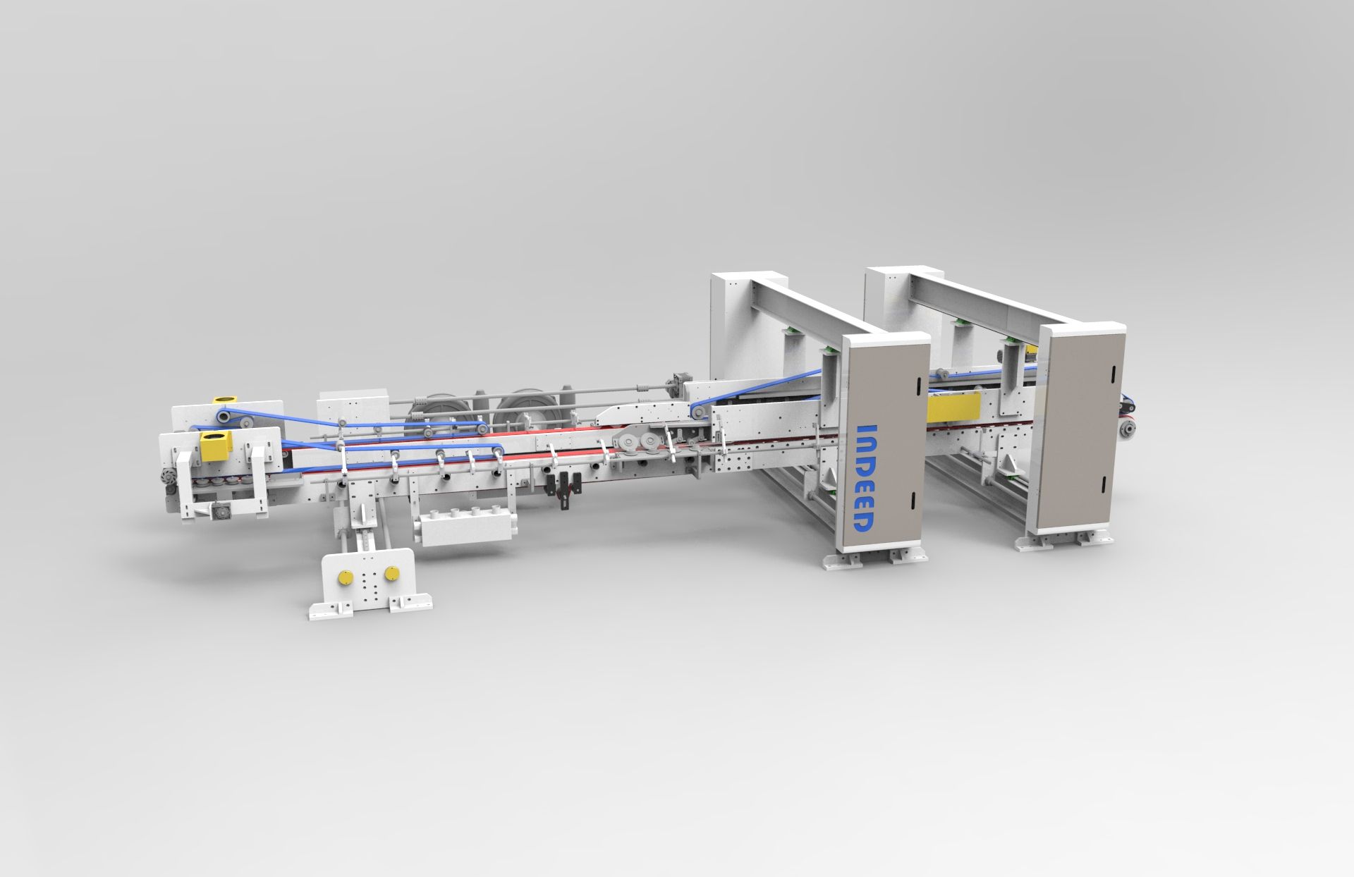 2.上皮帶采用獨立電機驅動,調節(jié)差速,控制紙箱成型效果。